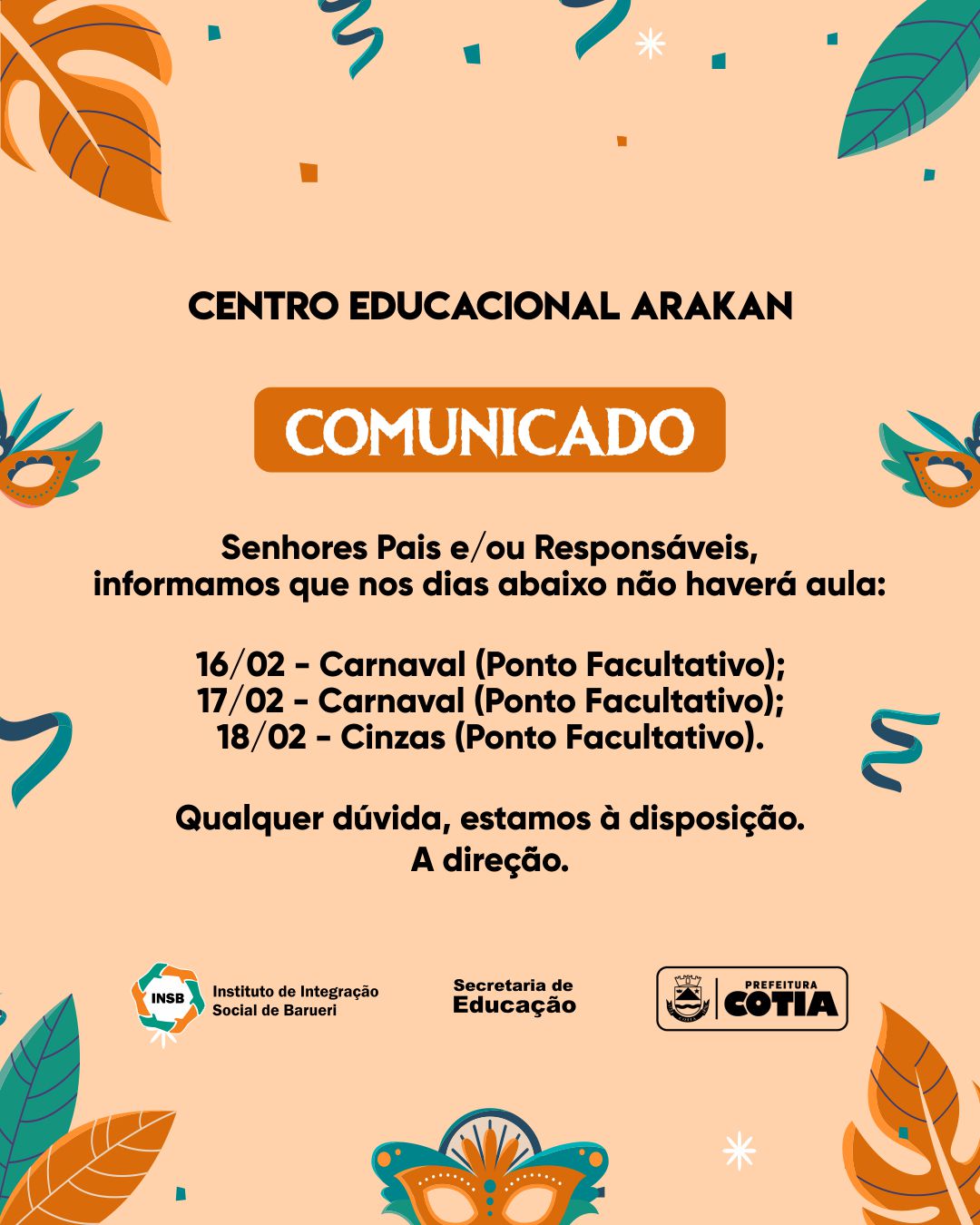 Senhores pais e responsáveis, informamos que nos dias 20/02 e 21/02, não haverá aula.