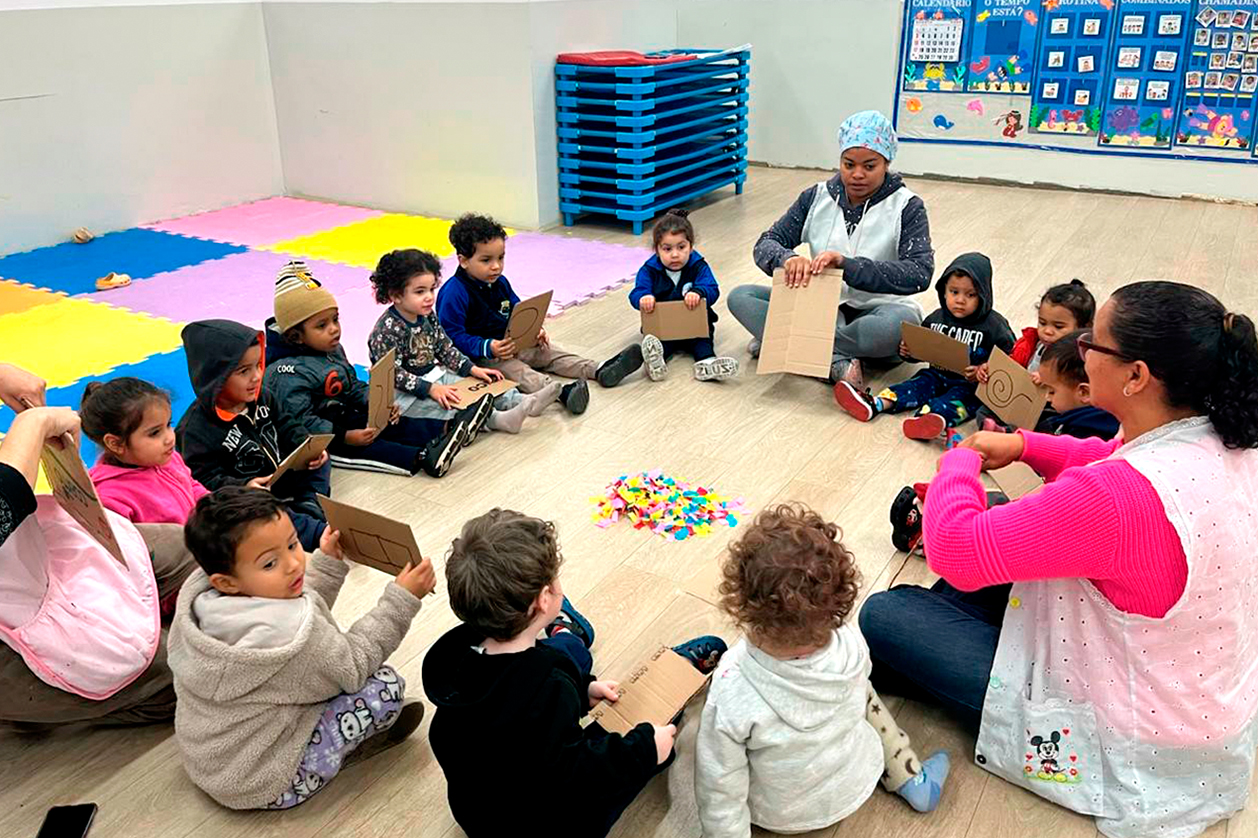 Durante a atividade, as crianças foram organizadas em roda e surpreendidas com um monte de papel picado no centro. Com pedaços de papelão nas mãos, elas criaram “vendavais” imaginários, movimentando os papéis pelo ar em uma brincadeira envolvente, guiada por comandos verbais e estímulos sonoros que incentivavam a expressão corporal e a linguagem.