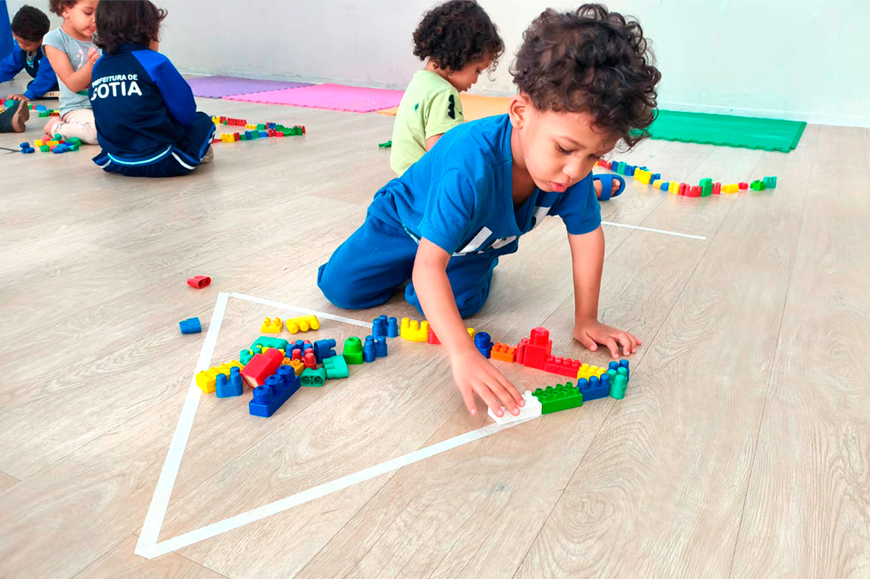 Durante a atividade, formas geométricas foram desenhadas no chão com fita adesiva, e os alunos foram convidados a preenchê-las com blocos de montar coloridos, observando tamanhos, cores e possibilidades de encaixe. A proposta permitiu que as crianças comparassem formas, diferenciassem linhas retas e curvas e trabalhassem em conjunto, promovendo concentração, criatividade e participação ativa no processo de aprendizagem no Centro Educacional Arakan.