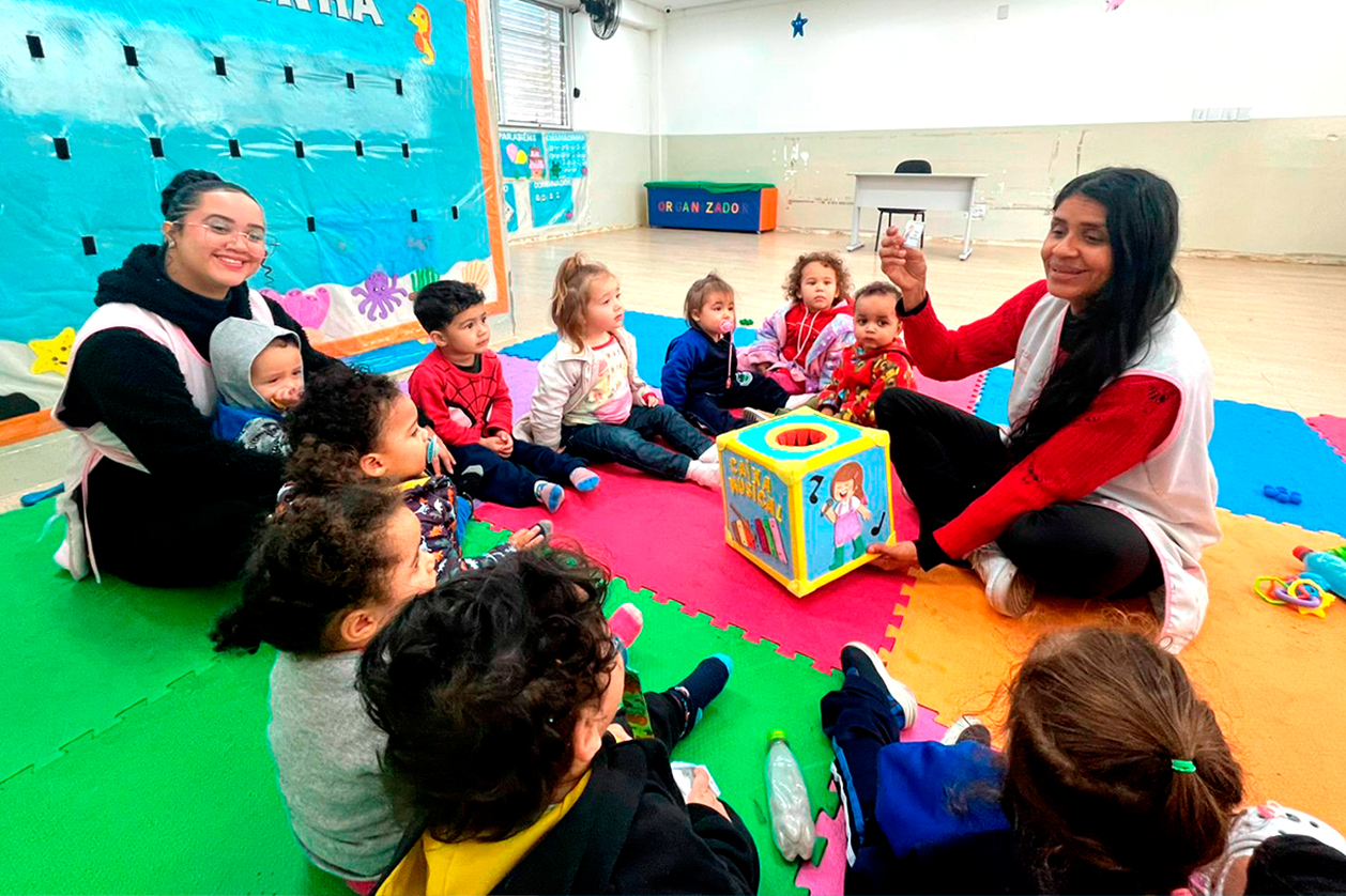 A cada imagem retirada da caixa, uma nova cantiga, som ou movimento era apresentado, incentivando a escuta atenta, a experimentação sonora e a coordenação motora. As crianças responderam com entusiasmo aos estímulos musicais, interagindo com os colegas e demonstrando alegria ao reconhecer ritmos e melodias, além de se movimentarem ao som das canções.