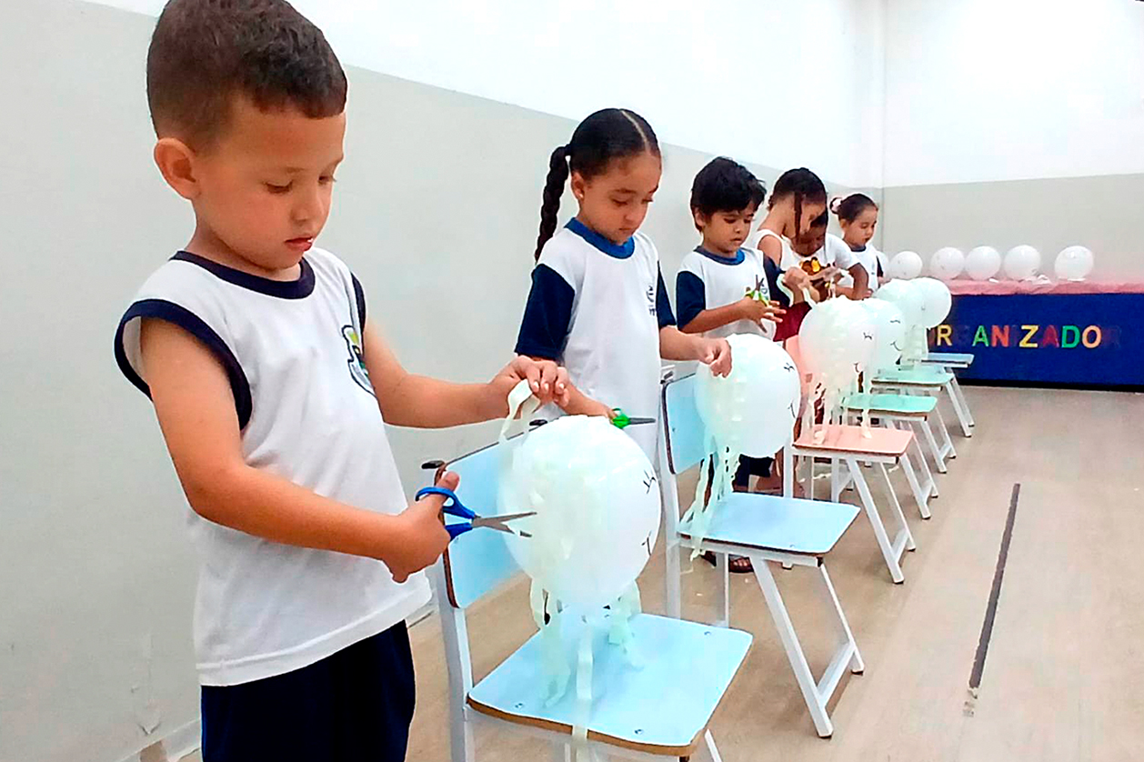 Na prática, as crianças transformaram um balão decorado com fios de papel crepom em um “cliente” de salão, cortando os fios apenas com a mão dominante, sem segurar o balão com a outra mão um desafio intencional que estimulou precisão, foco e coordenação viso-motora. O engajamento foi alto e os resultados muito positivos: as crianças demonstraram evolução no manejo da tesoura, maior estabilidade corporal e concentração prolongada. A ambientação lúdica transformou o exercício motor em uma experiência divertida e expressiva, reforçando o compromisso do Centro Educacional Arakan com o desenvolvimento integral e prazeroso das crianças.