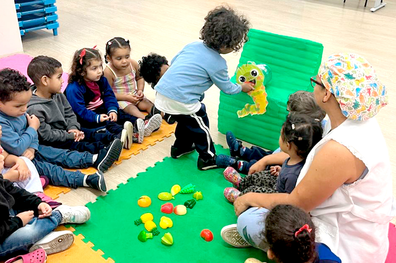 A atividade começou com uma roda musical na qual as crianças cantaram a canção A Lagarta Comilona. Em seguida, vivenciaram o momento de “alimentar a lagarta” com frutas e legumes, aproximando-as do tema da alimentação saudável de maneira divertida e significativa.