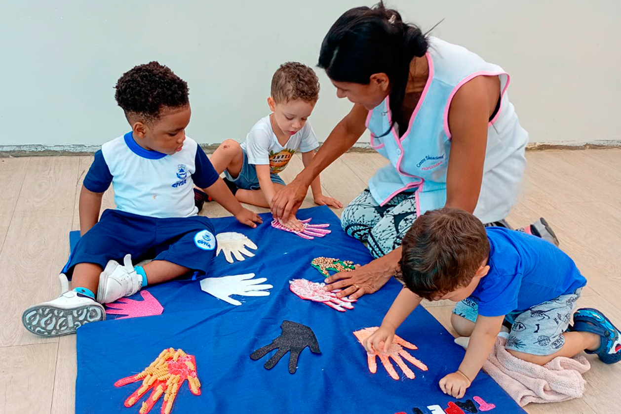 A atividade foi organizada com um tapete no chão contendo diversas texturas, como macia, áspera, lisa, rugosa, gelada e fofinha. Inicialmente, as crianças observaram e tocaram os materiais com as mãos e, em seguida, foram convidadas a caminhar e sentir as sensações com os pés. Durante a exploração, a professora estimulou a oralidade com perguntas sobre as percepções das crianças, incentivando que compartilhassem quais texturas mais gostaram e como se sentiam ao explorá-las.
