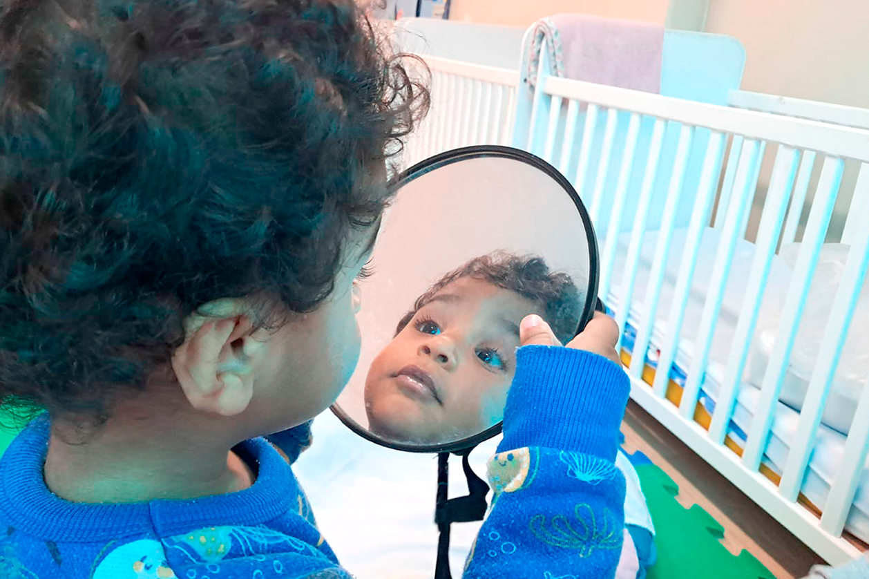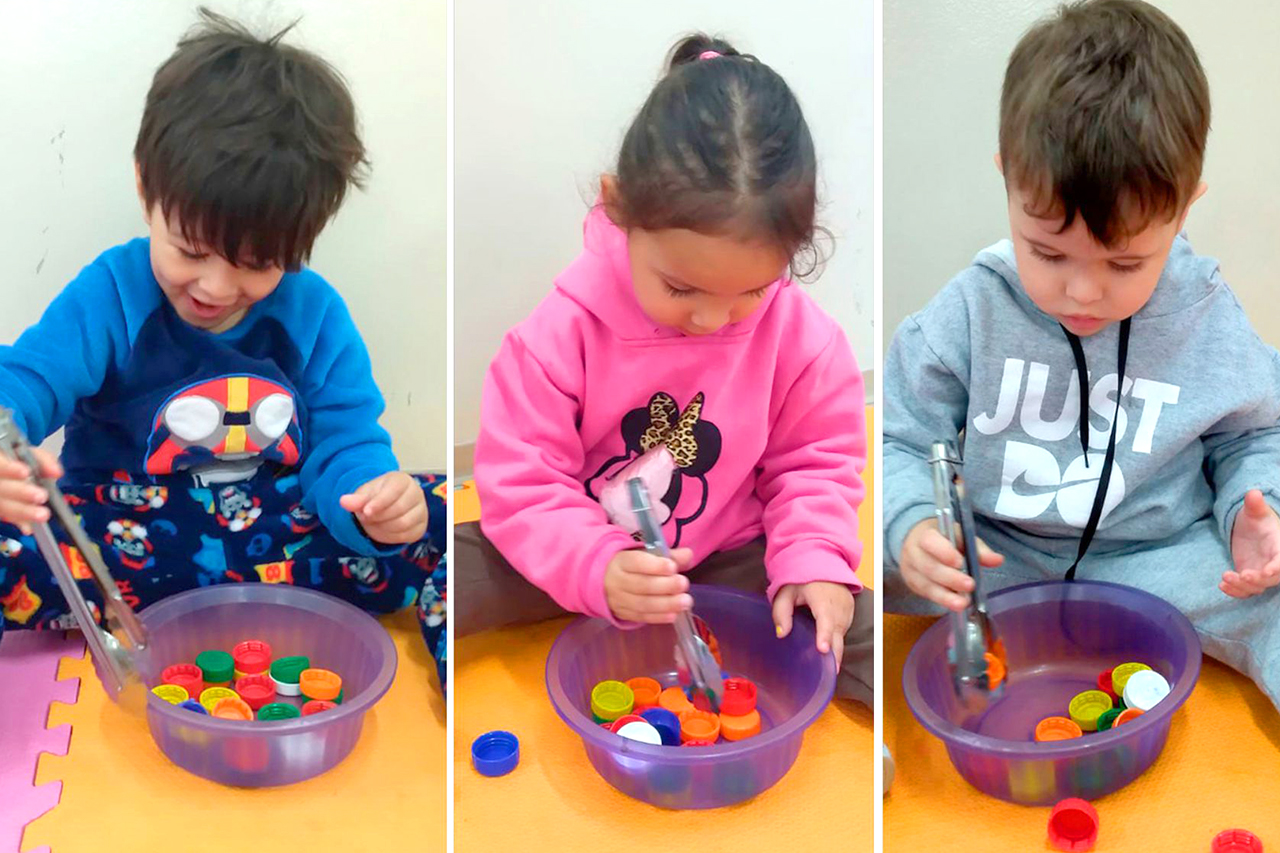 Utilizando uma bandeja, duas vasilhas, um pegador de macarrão e tampinhas de garrafas pet, a educadora propôs um desafio aos pequenos: transferir as tampinhas de uma vasilha para a outra. Utilizando o pegador de macarrão, as crianças retiravam as tampinhas de uma das vasilhas, repetindo o processo até que a bacia estivesse completamente vazia.