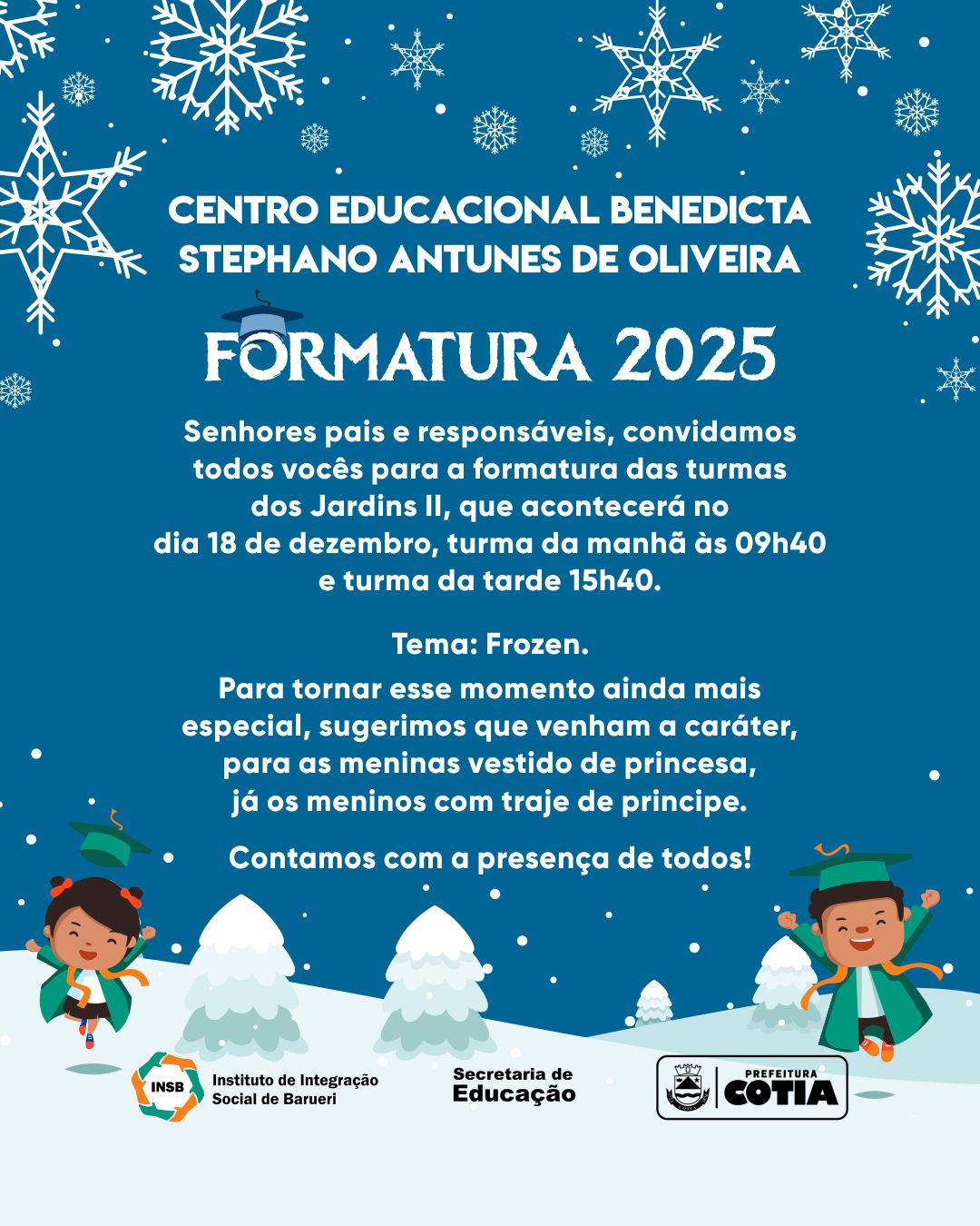 Senhores pais e responsáveis, convidamos todos vocês para a formatura das turmas dos Jardins I ...