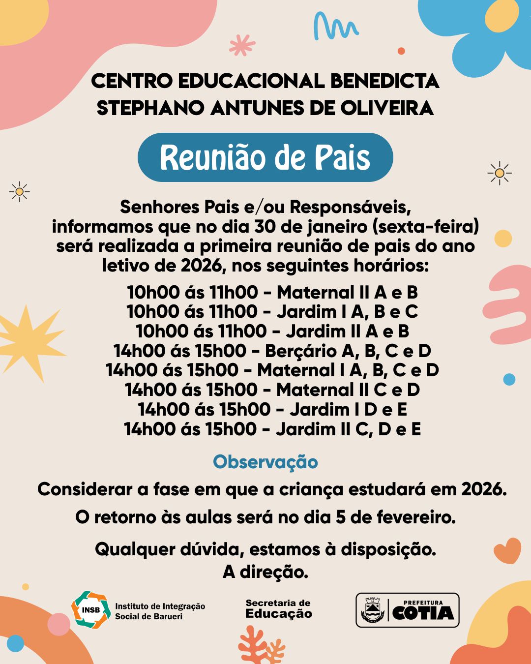 Senhores pais e responsáveis, informamos que a nossa reunião de pais e rematrícula para 2023, ...