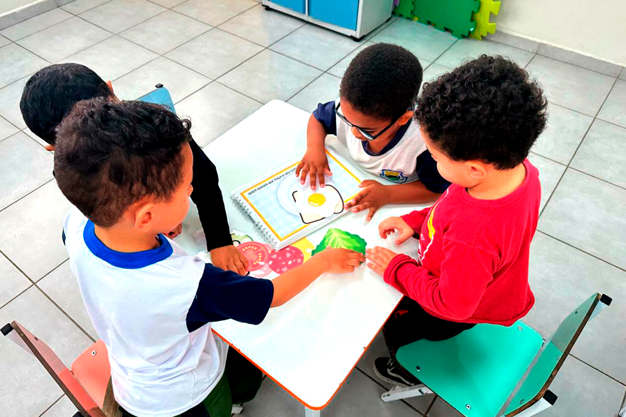 O momento de contação da história foi enriquecido com recursos interativos: um livro com figuras em velcro que permitiu que as crianças colassem os ingredientes conforme o enredo se desenvolvia. Em seguida, os alunos exploraram alimentos plastificados, criando suas próprias combinações de sanduíches em grupo. Essa abordagem lúdica possibilitou a experimentação, a troca entre os colegas e a ampliação do vocabulário, tornando o aprendizado ainda mais envolvente.
